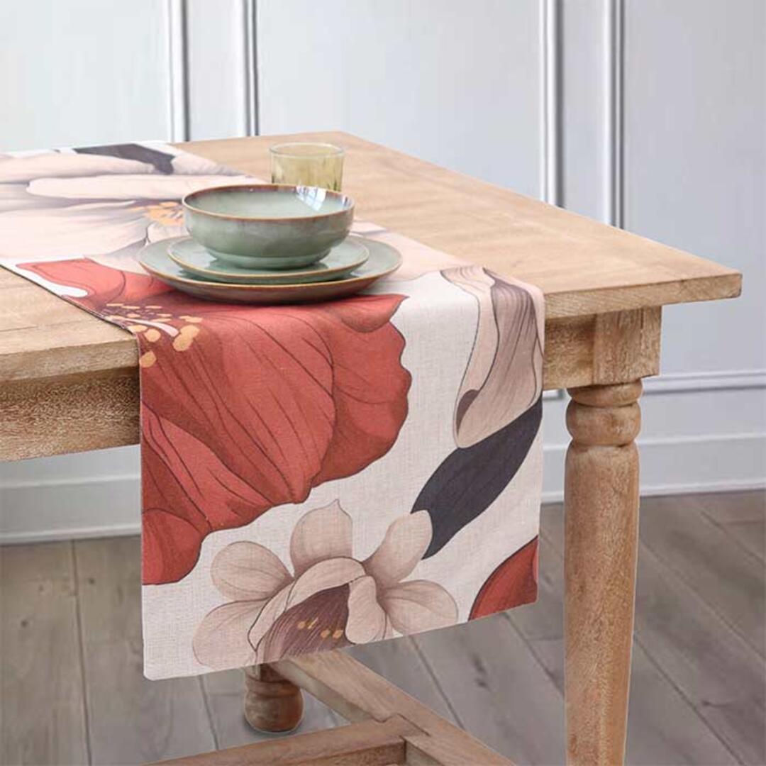 Runner Innovaliving Autumn Color realizzato in misto cotone, con stampa decoro floreale nei toni del ecrù/caramello.