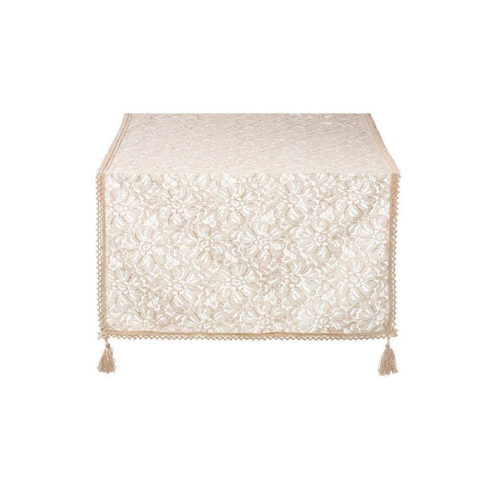 Runner L'Arte di Nacchi 70% cotone e 30% nylon, decorazione floreale completamente in pizzo colore avorio con nappine alle estremità.