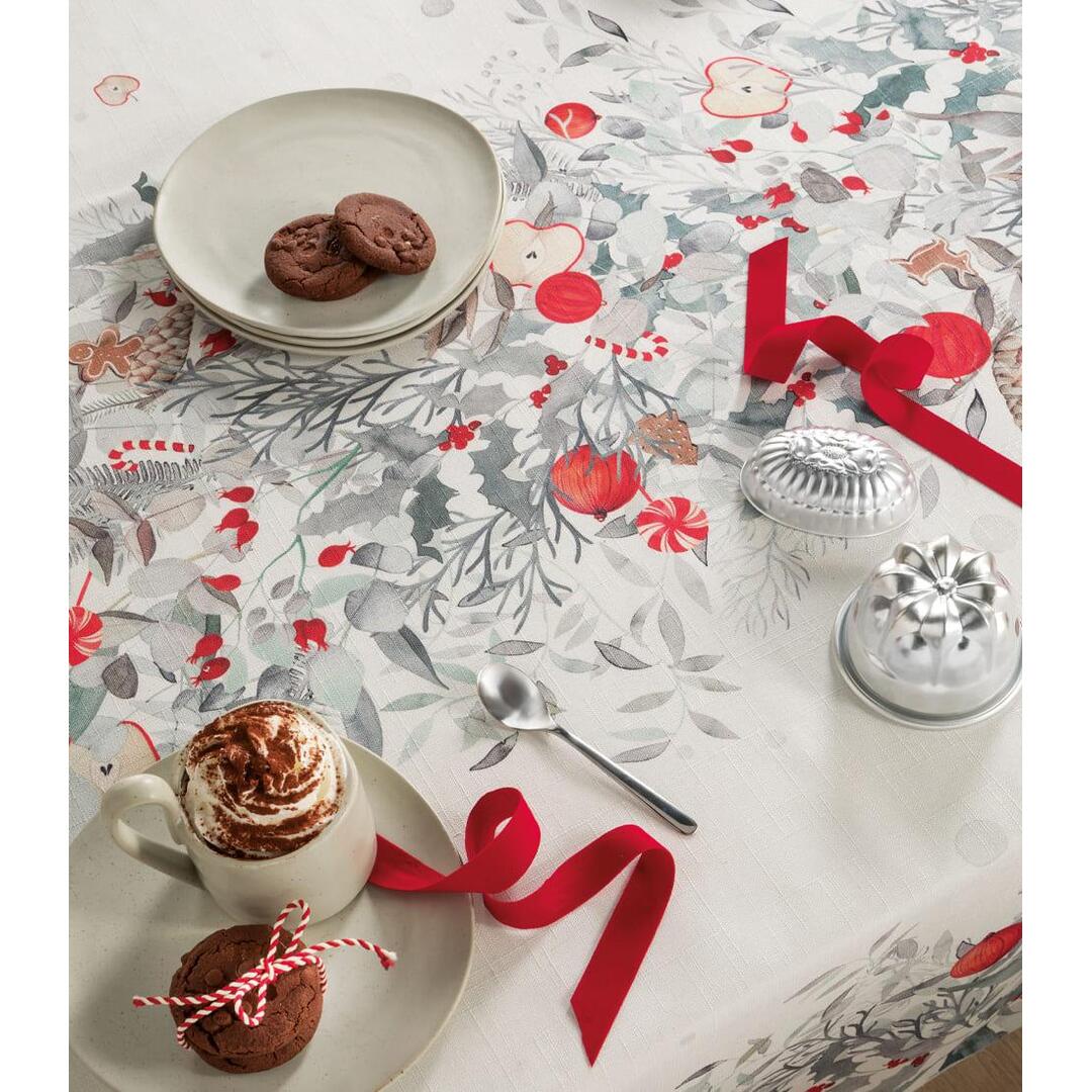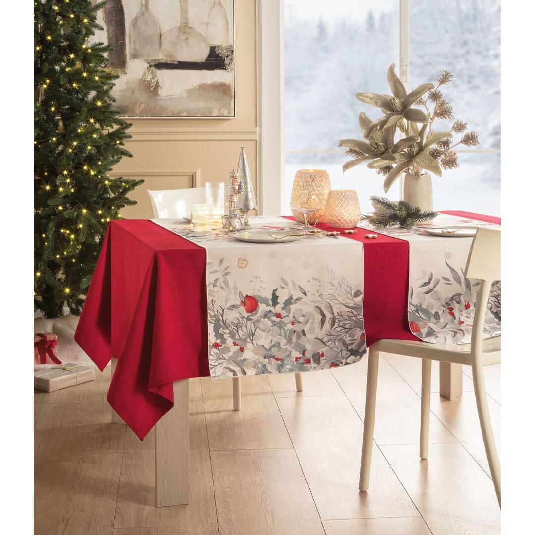 Runner Oca Nera in filato antimacchia e idrorepellente decoro agrifoglio in tessuto poliestere 100% Made in Italy. Da abbinare ad una tovaglia tinta unita per una originale tavola natalizia.