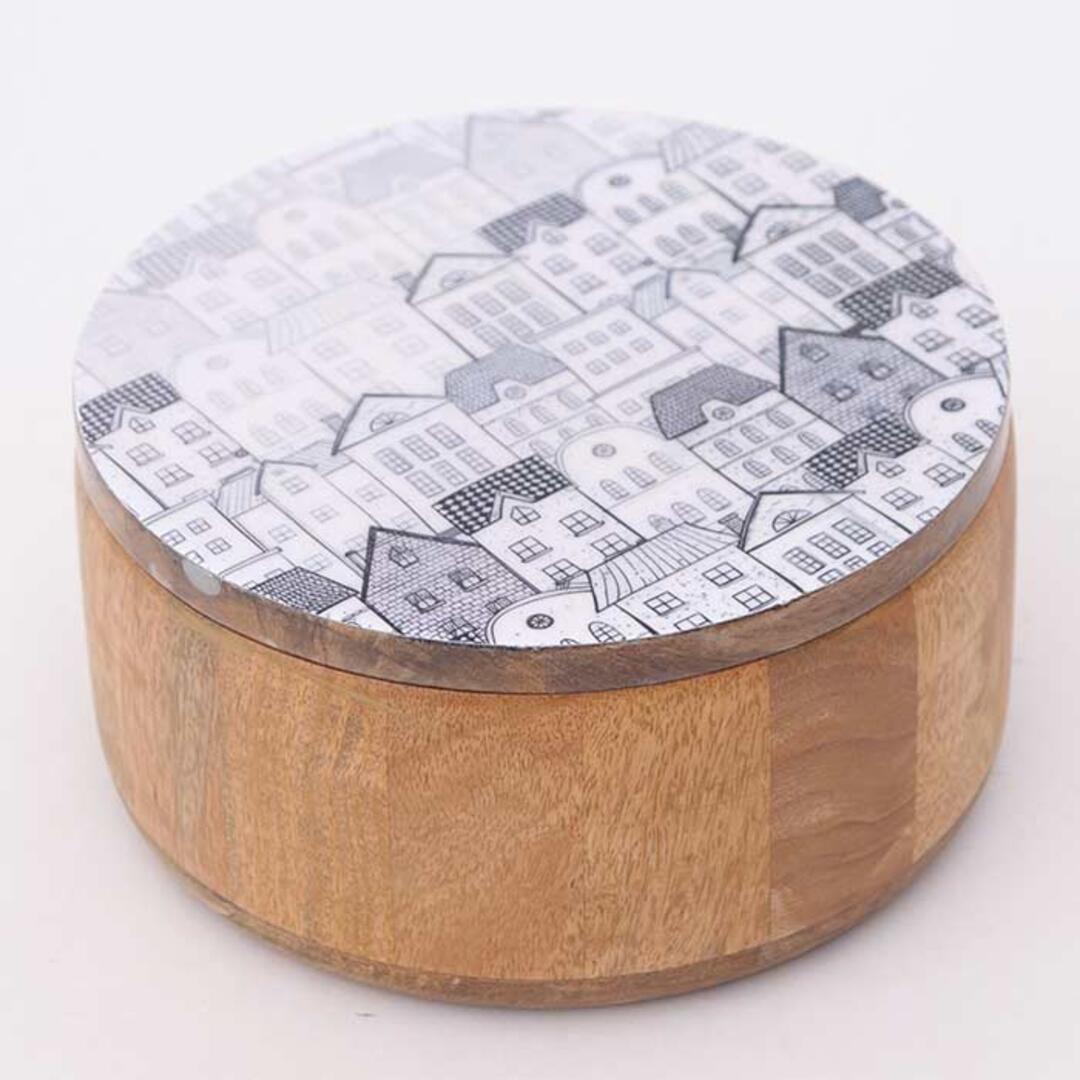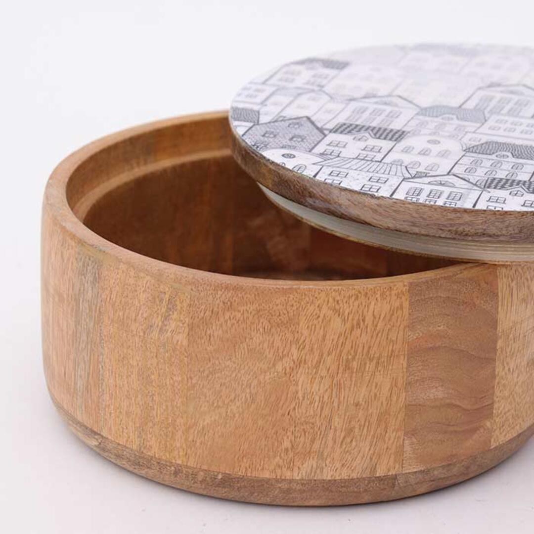 Scatola tonda Innovaliving Village in legno di mango finitura naturale con decorazione laccata lucida sul coperchio.