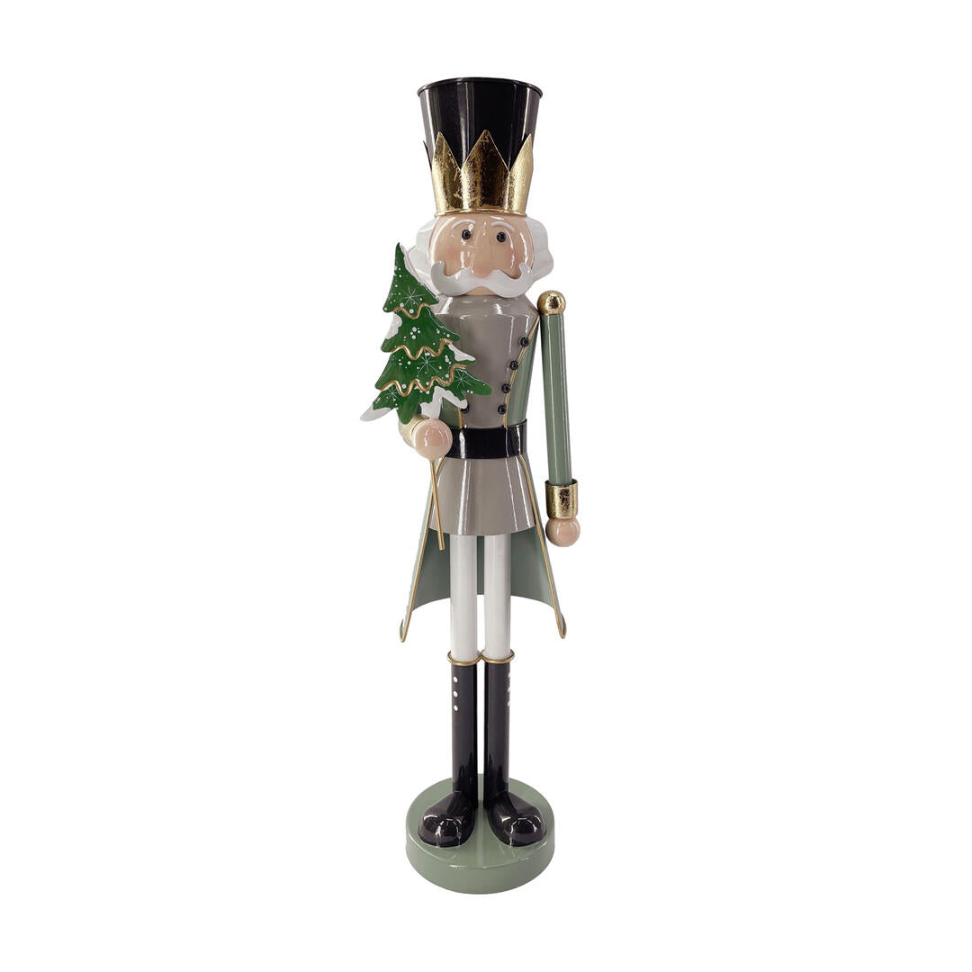 Schiaccianoci Elle Gift in metallo vestito colore verde salvia, cappello/stivali neri e dettagli dorati con alberello in mano.