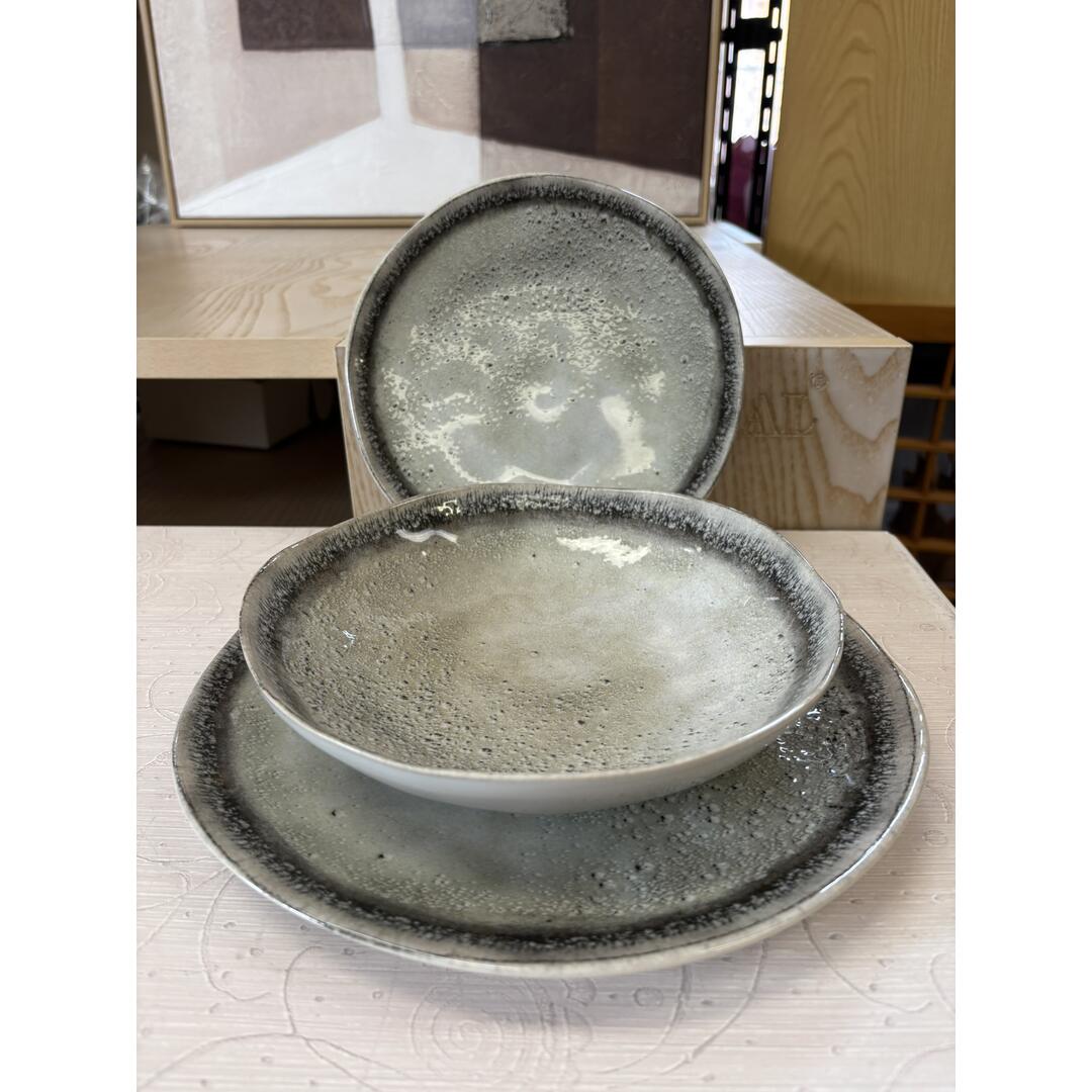 Servizio tavola Excelsa Afrodite in porcellana nelle gradazioni del grigio con effetto smalti reagenti, caratterizzato da forme irregolari e piatto fondo a coup.