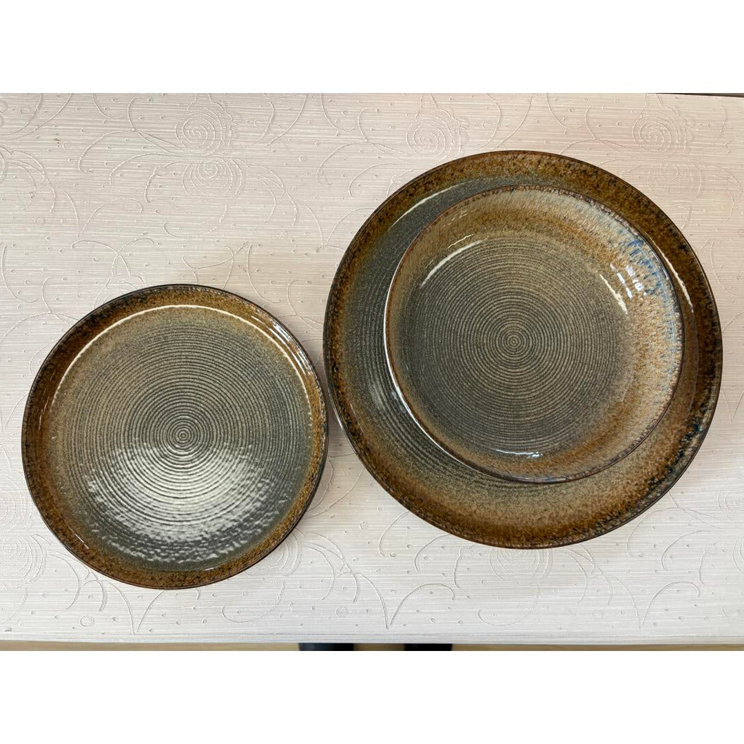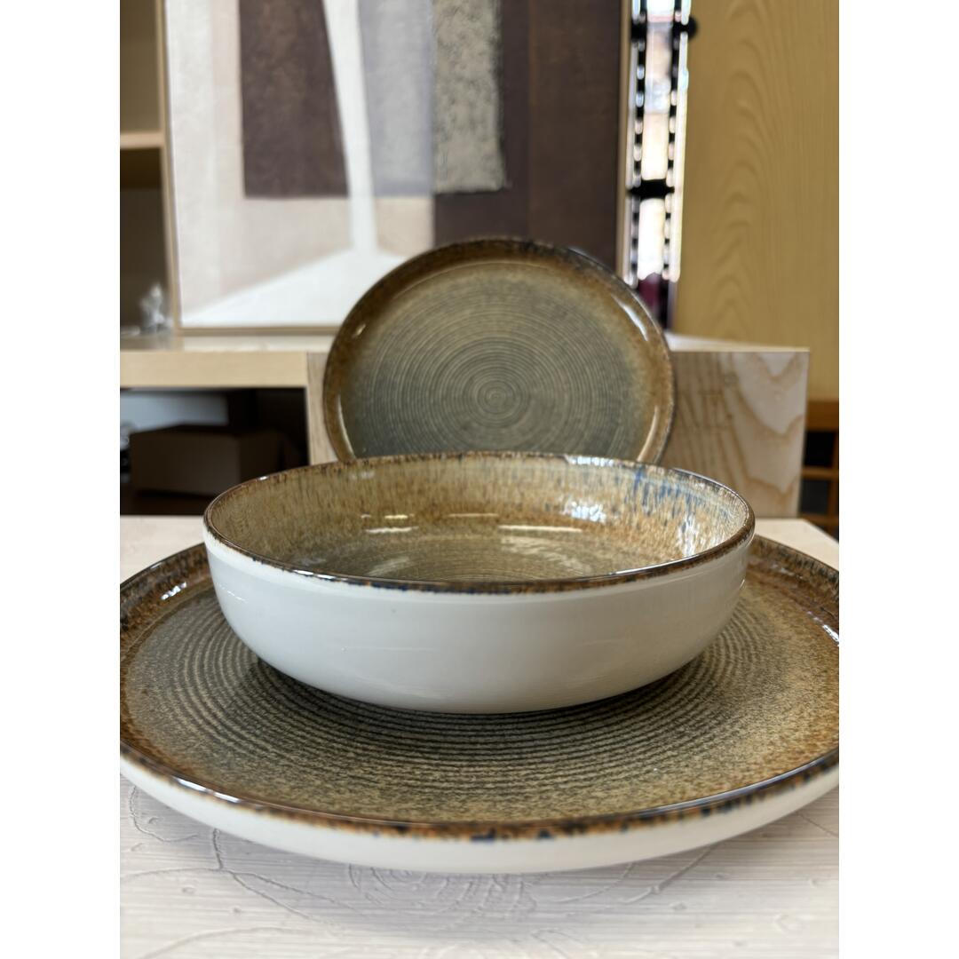 Servizio tavola Excelsa Demetra in porcellana colori marrone/grigio con effetto circolare e smalti reagenti, caratterizzato da forme squadrate e moderne.