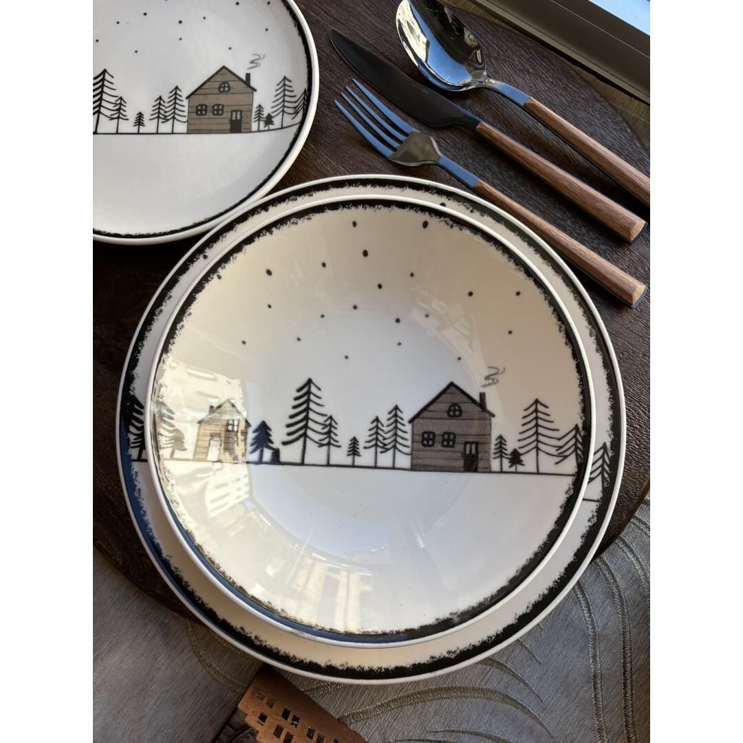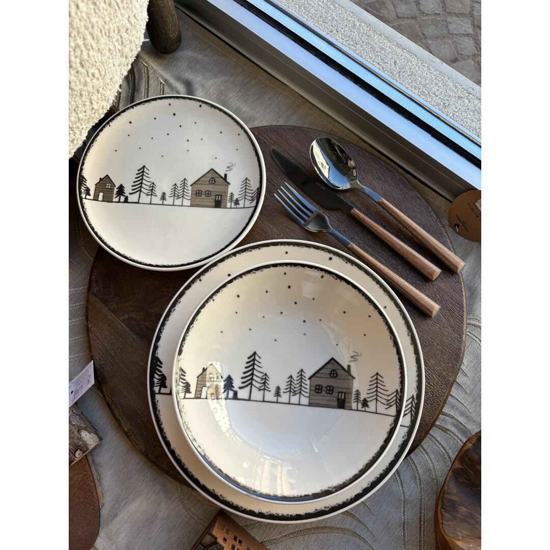 Servizio tavola H&H Casette in porcellana colore bianco avorio dal bordino nero con decoro minimal ed essenziale casette e abeti colori grigio/nero. Forma del piatto fondo tradizionale a coup.