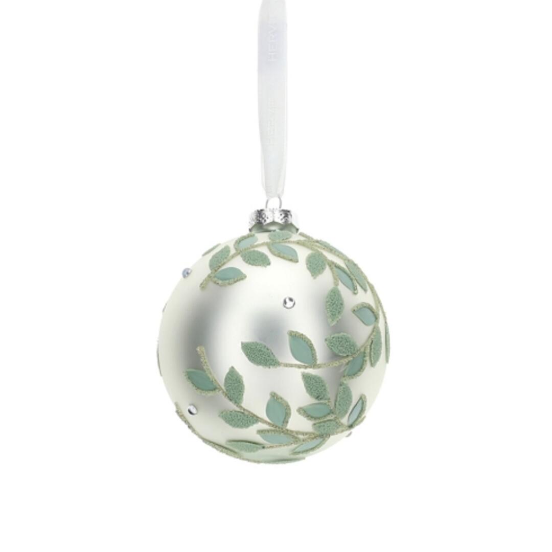 Sfera Hervit realizzata in vetro soffiato colore champagne con decoro in rilievo foglie verde salvia e brillantini