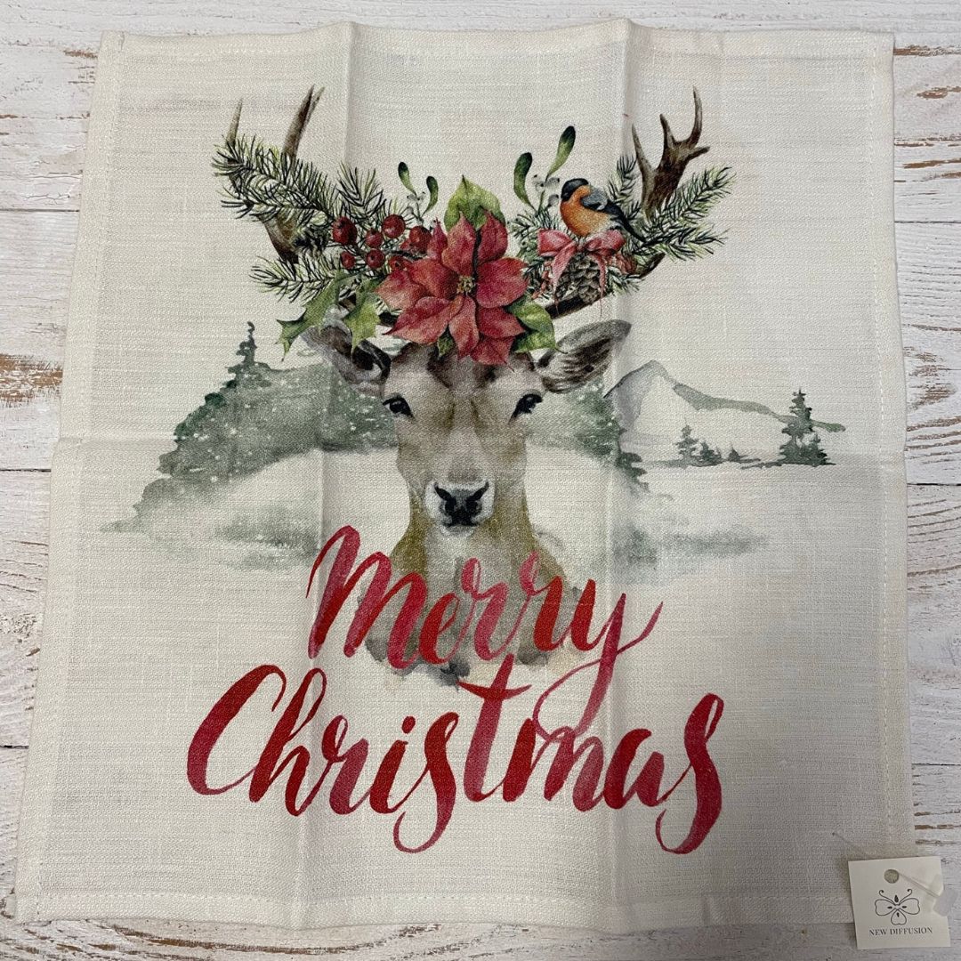 Sottopiatto New Diffusion quadrato decoro cervo con scritta natalizia in 100% puro lino