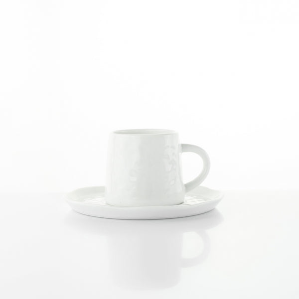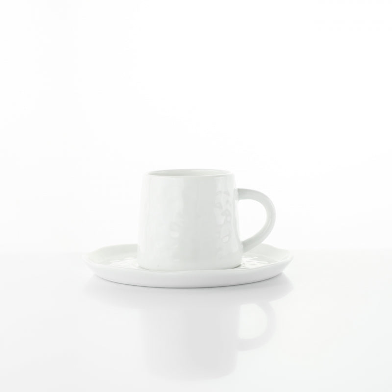 La forma è unica e accuratamente irregolare sulla superficie di ciascuna tazzina e piattino. Eventuali lievi imperfezioni sono dovute alla lavorazione artigianale e sono segni distintivi dell'unicità del prodotto.