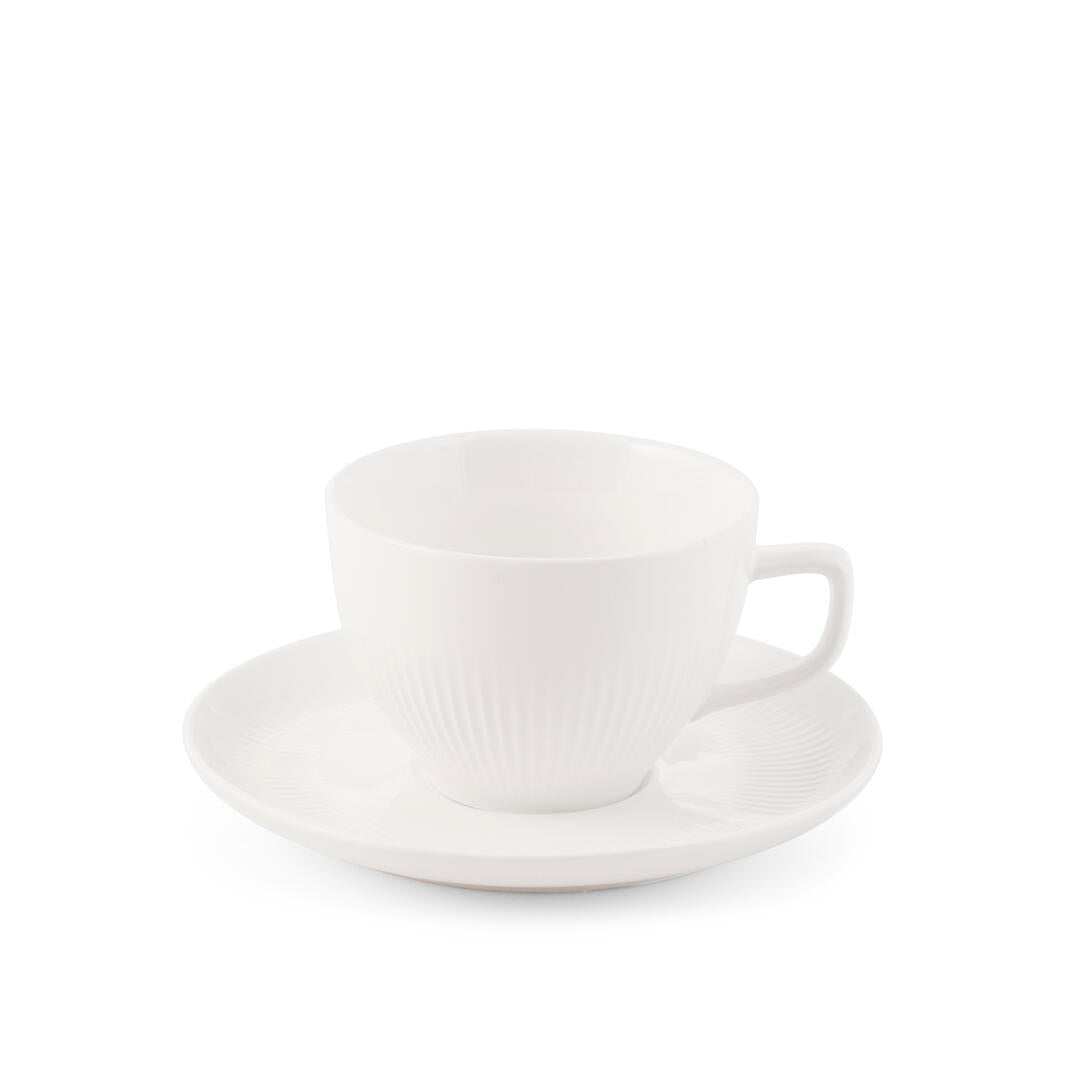 Realizzato in porcellana New Bone China, presenta linee pulite e proporzioni equilibrate che valorizzano ogni tipo di tè o infuso. La delicata scanalatura esterna arricchisce il design, conferendo profondità e personalità, mentre il piattino abbinato aggiunge un’eleganza discreta e sempre attuale alla tavola.