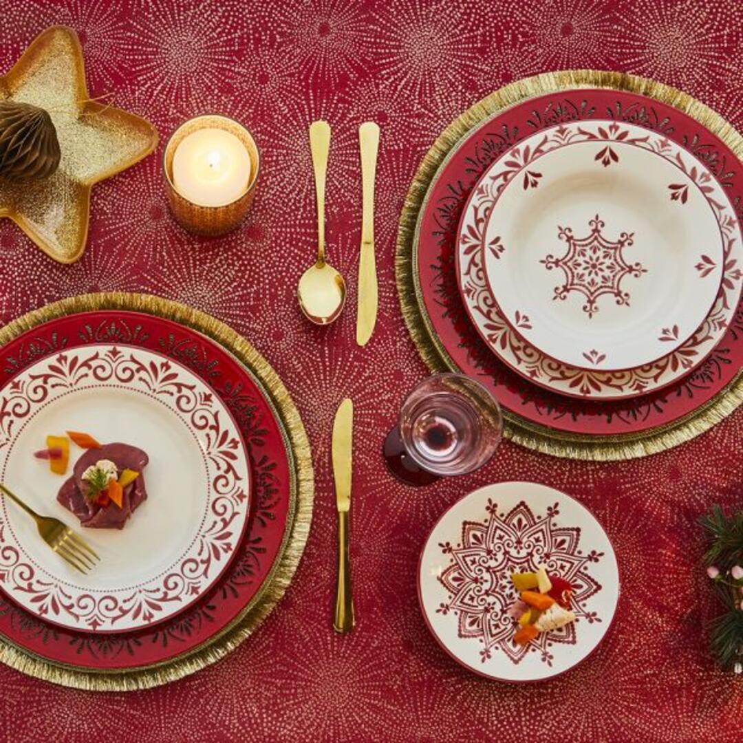 Tovaglia Tognana Vega in tessuto poliestere antimacchia colore rosso con decoro dorato.